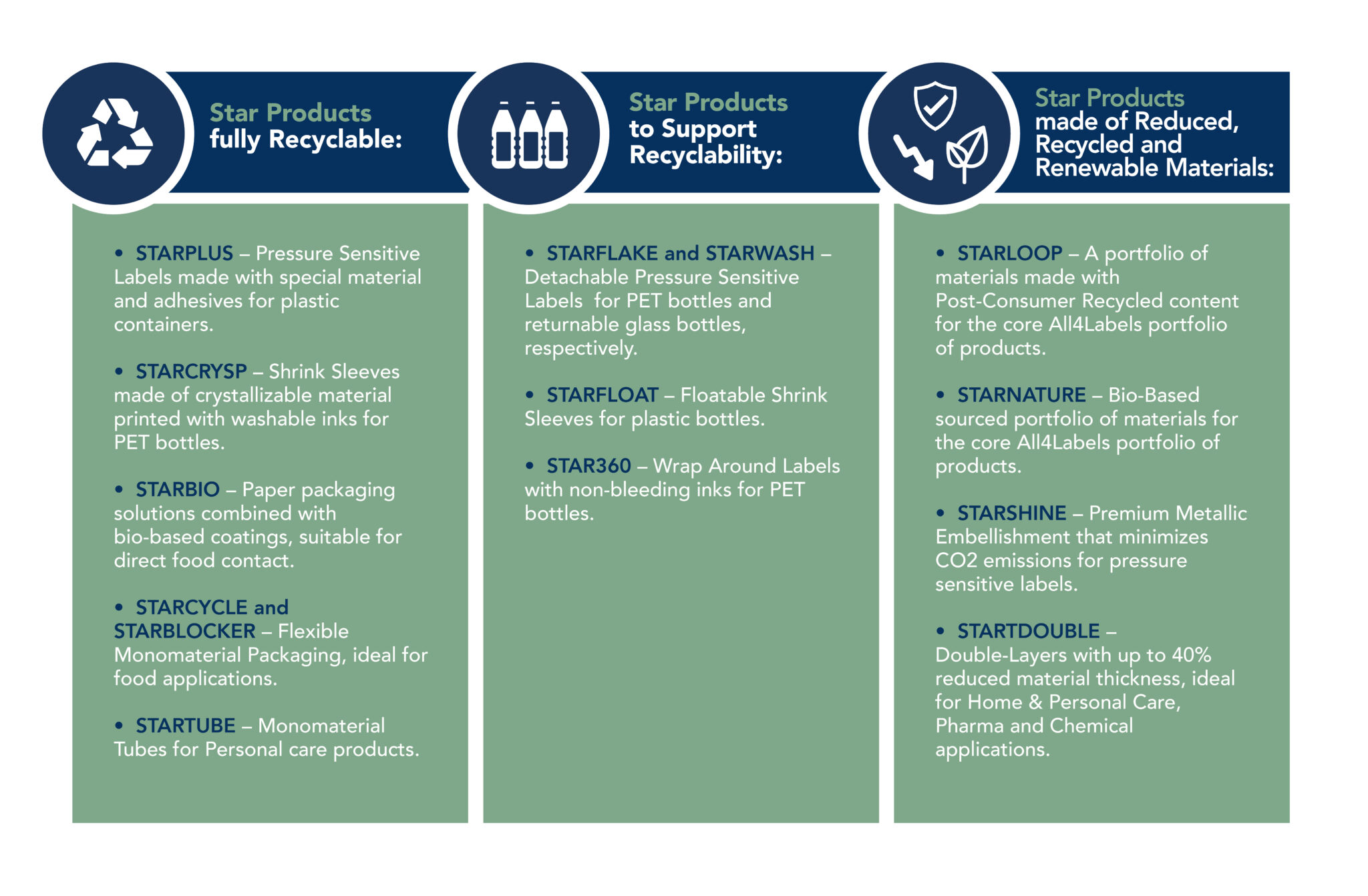Star Products will support and enable full recyclability, while utilizing reusable and renewable materials:
