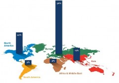 Regionally, Europe claims the largest market share with 56% of production happening there. North America follows with 22%, Asia with 13%, and South America and AME with 5% and 4% respectively.