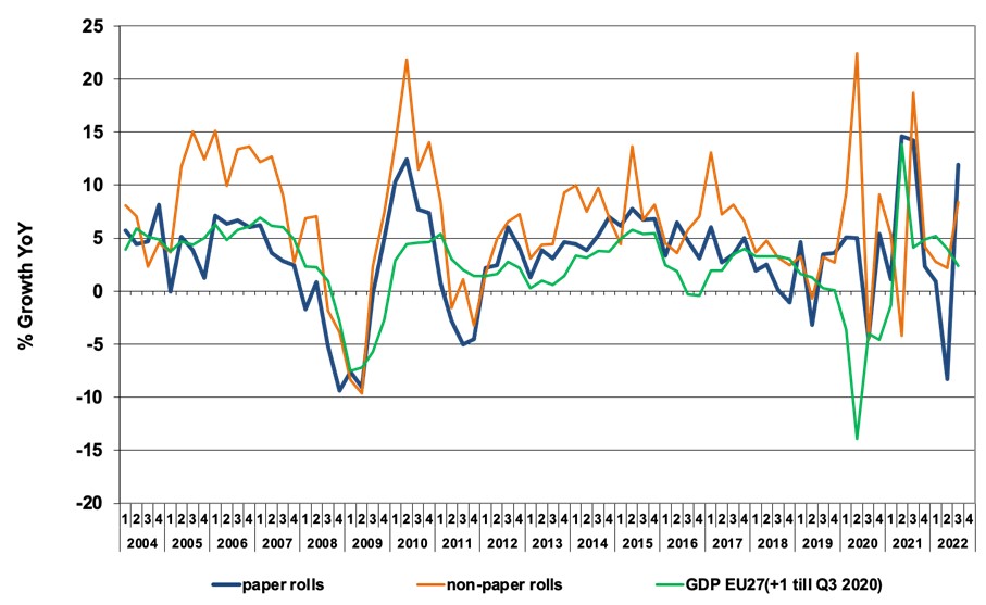 Compared to the third quarter in 2021, European consumption of paper roll labelstocks increased by no less than 11.9%, after a sharp YoY drop of 8.3 % in the previous quarter. For filmic roll label applications, demand compared to the same quarter in 2021 accelerated by a healthy plus of 8.4 %, compared to a modest year-on-year growth of 2.2 % in Q2.