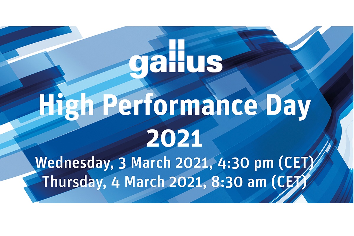 Label printers around the world will learn everything there is to know about label production on March 3 and 4, 2021 with the “Virtual Gallus High Performance Day”. Using this new event format, Gallus will present the highlights from its portfolio of digital and conventional printing presses. The demo sessions will be followed by breakout sessions where label experts will provide exclusive insights.