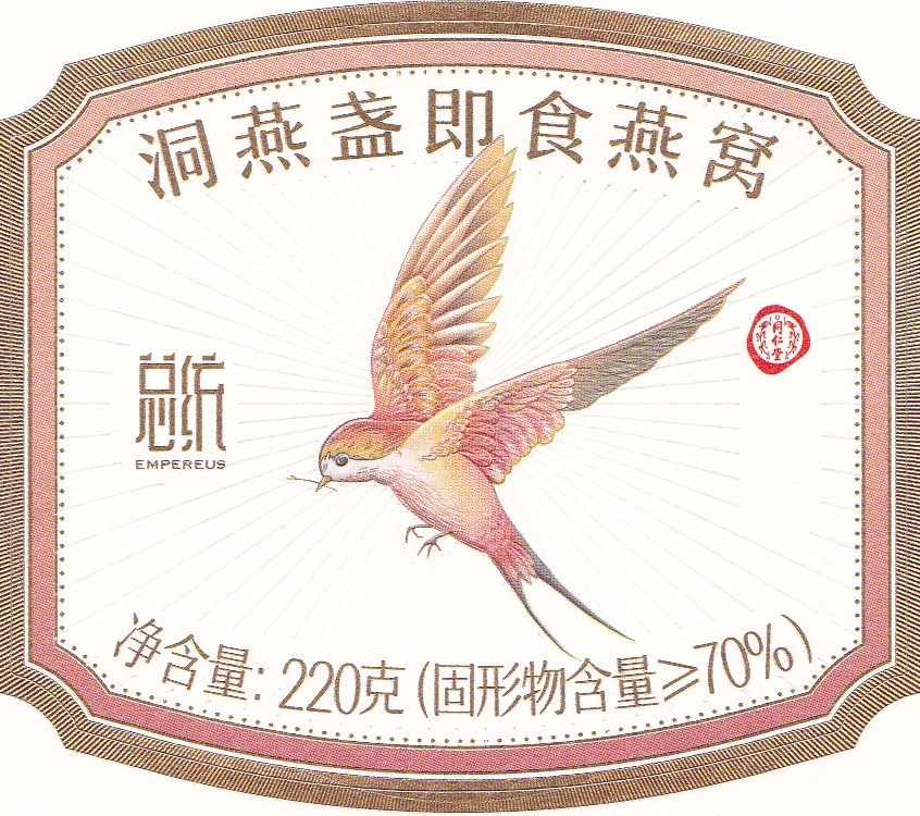 The label central image of a Golden Swiftlet is printed in four colour process, using a particularly fine screen ruling, but in excellent register. The image is further highlighted by the use of very accurate embossing emphasising the feathers.